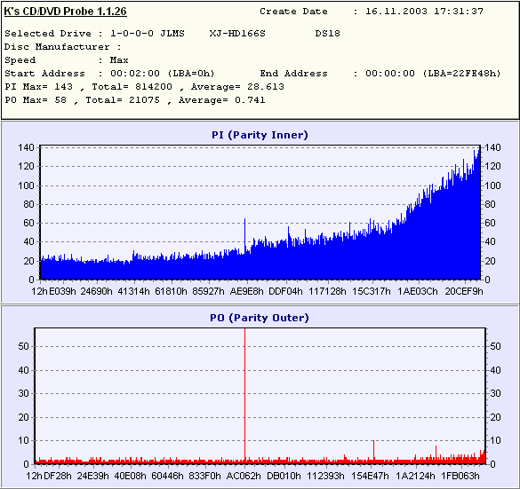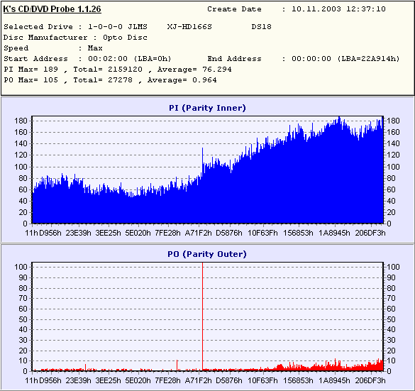 ![]() Lead-In data. 00 6A 00 00 01 40 C1 FD 9E D8 52 00 02 87 0E 13 .J...@....R..... 87 88 80 00 03 4F 50 54 4F 44 49 00 04 53 43 52 .....OPTODI..SCR 30 30 34 00 05 88 80 00 00 00 01 00 06 0B 0F 11 004............. 86 67 80 00 07 88 80 00 00 00 00 00 08 05 16 0D .G.............. 10 0A 09 00 09 97 06 0E 0B 58 88 00 0A C0 00 00 .........X...... 00 00 10 00 0B 07 1A 17 B8 89 75 00 0C D5 79 88 ..........U...Y. 80 00 00 00 0D 00 00 D0 00 00 00 00 00 00 00 00 ................ Recording on ASUS DRW-0402P/D, 2x, Lite-On Kprobe reading ![]() Recording on SONY DRU510-A, 2x, Lite-On Kprobe reading ![]() Recording on ASUS DRW-0402P/D, 2x, Toshiba Nero reading ![]() Recording on SONY DRU510-A, 2x, Toshiba Nero reading ![]() Recording on ASUS DRW-0402P/D, 4x, Lite-On Kprobe reading ![]() Recording on SONY DRU510-A, 4x, Lite-On Kprobe reading ![]() Recording on ASUS DRW-0402P/D, 4x, Toshiba Nero reading ![]() Recording on SONY DRU510-A, 4x, Toshiba Nero reading ![]() In spite of the high level of errors the discs recorded were successfully