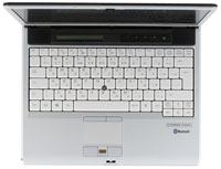 The front panel houses a display lid latch, a wireless switch (in our case it affected both Bluetooth and Wi-Fi), and a small vent grid on the left. The left flank houses PC Card and ExpressCard slots, FireWire, headphones-out, mic-in, video output (you will need a special cable, included into the bundle), VGA output covered by a rubber lid, and a power connector. There is another vent grid in the middle of the left flank. The right flank contains only a Kensington lock, a modem input, a bay with an optical drive inside, a single USB 2.0 port. The rear panel houses an IrDA port, two USB 2.0 ports, a battery, another latch, and a LAN port. The bottom of the S7110 contains several vent holes, docking connector for port replicator, HDD and memory bays. The layout of connectors is rather convenient. The modem connector may be inconvenient – it's too close to a user, and a plugged cable hampers access to the optical drive and USB 2.0 port. But it's rarely used these days, so this is not very relevant. What's more serious, there are only three USB ports. And only one of them is easily available – on the right flank. The only excuse is four ports in the dock station, which can be used in the stationary mode. It also contains a full set of everything you can think of: VGA and DVI-D (supporting HDCP), serial and parallel ports, LAN port, PS/2, audio in/out, a power connector, and a lock (as our bundle lacked a port replicator, we publish information from the official FSC documentation). The notebook looks less strict with the open lid – silvery plastic, light-grey keyboard, black insert with speakers, indicators, and buttons. Even though the speakers are small, they are sufficient for a small room. You cannot get good low frequencies from them, of course. But they will do for business applications. The group of indicators is implemented as a monochrome LED. You can see it only when the lid is open. It's quite a controversial solution, because you can see the status of your notebook (a battery charge level or sleep mode) only when you open the lid and have a look at the screen. It's hard to tell why engineers did not use standard LEDs (for example, in addition to the display). The group of additional buttons consists of four keys, labeled "1", "2", "E" and "R". The last two buttons are used to switch to power saving mode and to run the backup utility. But you can use the bundled software to reassign all the four keys. The keyboard is actually typical of 14" models (wide 13" notebooks are also equipped with keyboards of the same size). We can note the narrow left Shift, big BackSpace, and no Home and End buttons. We tested the "international" sample, so the keyboard in Russian models may differ a little. The main buttons are 18×18 mm, buttons in the upper row and cursor keys are 16×13 mm. There are two pointing devices – a touchpad and a pointstick. It's done to please everybody. There are also two sets of mouse buttons. A finger scanner is installed between the touchpad buttons. It can also be used for vertical scrolling. The notebook with its battery and an optical drive weighs 2.08 kg. The power adapter with a cable weighs 420 g. Package ContentsAs we tested a pre-sale sample, we cannot describe the bundle to the last component. Our box contained a notebook, a power adapter, S-Video cable and a set of optical discs with an operating system and Toshiba Bluetooth driver. These components will most likely be present in all bundles. According to the company representative, a port replicator will also come shipped with all models. Additional accessories to be bought separately include external storage devices (USB drives, a floppy drive, a card reader), power adapters (mains and car adapters, main and additional batteries, external chargers), a port replicator, various bags and folders, communication devices (ISDN cards, Bluetooth and Wi-Fi adapters, USB-LPT cable, web camera, etc), security devices (SmartCase cards in particular). Users are also offered memory modules, optical drives, and hard drives for upgrades. E, S, ะก and Celsius series of FSC LIFEBOOK notebooks can use the same accessories: PSUs, port replicators, optical drives and other devices for a bay (all devices in a module bay support hot swapping). All models come with preinstalled Microsoft Windows XP Professional, appropriate for a business notebook. Models with 1 GB of memory and more are labeled "Windows Vista Premium Ready". S7110 notebooks will also come with the following preinstalled programs: