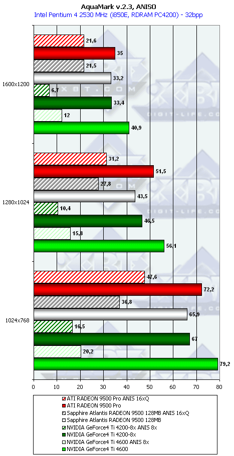 The victory of the RADEON 9500 over the Ti 4200 is quite logical (4 pixel pipelines working at a higher clock speed), and the faster operation of the RADEON 9500 PRO makes me think that it has 8 texture units, not 8 pipelines. Sprites