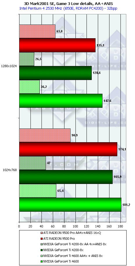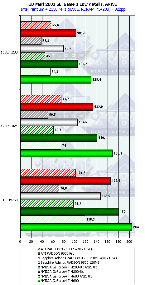 ![]() In closing of the synthetic part of the tests I can only repeat what I said after the fillrate test: the RADEON 9500 PRO has 8 pipelines with one texture unit on each, i.e. 8x1. Also, we proved that it's coupled only with two controllers and therefore 128bit hardware memory bus (though the virtual 256bits in AA are evident). Well, ATI is really smart - it modernized the PCB, made it cheaper and took in those who wanted to turn RADEON 9500 PRO into RADEON 9700. In the mode of execution of vertex shaders the chip is forcedly slowed down relative to the 9700, while in the fixed TCL mode its performance is not limited and equals the normal R300, which will definitely affect applications without vertex shaders. However, everyone is satisfied: ATI is not bothered with questions like how they dare make relatively cheap cards with a 256bit bus, NVIDIA doesn't giggle aside thinking that that it might be too good to provide 256 bits on a mainstream card. The protection works. 3D graphics, 3DMark2001 - game testsNote: The diagrams do not include the RADEON 9500 64MB due to some technical problems, but it was taken into the comparison tests, and this card can be found in the comparison table. But I think that such card shouldn't be priced over $100. 3DMark2001, 3DMARKS