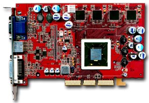 While the RADEON 9500 used the PCB from the RADEON 9700 PRO, ATI made some alterations in the design for the RADEON 9500 PRO. Now all 4 memory chips on each side of the card are put in a straight line, and the external power supply connector is shifted to the middle from the edge. Now look at the distinguishing features, in particular, at the tracks connecting the chip and the memory modules as this is exactly what the reviewers refer to when focusing on a 128bit memory bus. You can download the animated GIF file(430K) which shows the differences more distinctly. On the top of the RADEON 9500 PRO cards the tracks are located more densely because of the upper positions of the chips. If you wish, you can download the animated GIF file (450K). There are no tracks to the core's right - it's an entire screen. But it's still unknown whether the tracks to the chip's pins (which are as many as before) are also missing in the internal layers. The western reviewers say that it's a sign of a 128-bit bus that the visible tracks go from the smaller chip's side. If you wish, you can download the animated GIF file(490K). On the RADEON 9500 PRO the tracks are placed closer to each and they proceed not from the wider side of the processor but mostly from the top. Of course, it's unknown either whether the internal layers contain tracks or not. We can see a well-optimized layout of the PCB, but it's still unknown whether the bus is 256bit or 128bit. The developers have done their best to make it as cheap as possible, because production of relatively inexpensive cards on a dear PCB means having no profit at all. I won't be surprised if they release RADEON 9700 cards on a similar PCB (such PCB will hardly match the RADEON 9700 PRO because the higher the memory frequency, the tougher the requirements, in particular, the distance from the chip to the memory must be greater; on the old PCB it's the same - the chips are located around the VPU, while on the new PCB the distance is noticeably longer (regarding the farther chip)). Why do we suppose 256 bits? If you look at the memory, you will see that it's possible to access the whole memory of 128Mbit (=16MB) only using all its pins, as 4 banks are bound to them. That is why 16-bit access is hardly possible. But a 128bit bus is impossible at all in this case - one can only use the chips in two groups using only a half of the chips at the same time.