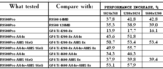 At first glance the lie looks harmonious. But life brings in corrections. Firstly, there are 128MB RADEON 9500 cards, though nothing is heard about 64MB on the RADEON 9500 PRO. Moreover, the RADEON 9500 128MB has a 256bit memory bus as you can see from the review on the preproduction sample in the list below. Theoretical materials and reviews of video cards which concern functional