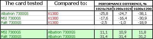 TABLE OF CONTENTSWe review expensive, even very expensive accelerators more and more often. And we leave budget solutions off-camera. Many readers are indignant. But everything is simple here: a budget solution has always been and will be slow; despite marketing efforts to show that a $100 card today would have cost you $400 two years ago, you must understand that games evolve. Indeed, a Low-End card will certainly demonstrate high results in Quake3 or Serious Sam 1, which could be demonstrated by old Hi-End cards. But it makes no sense today to buy a video card for old games, even if it costs $100. Former Hi-End cards can be found on a flea market even for a lower price, if you want to buy a card for old games. Games grow more complex, so Low-End cards have been marking time at 1024x768 without AA+AF on the brink of tolerable gameplay. Decent performance will be demonstrated only in 1.5-2-year old games. Even though there are still some users who want to spend just $70 and get super graphics, and all state-of-the-art games at maximum quality, and VIVO, etc, most users are reasonable. They understand that they cannot possibly expect high 3D performance from such a cheap card. That's why lots of these cards are bought just to connect a monitor to and to watch movies. Let's dwell on this issue. If we shift our focus from 3D, let it be video acceleration and even video decoding features. That is movies. We know well that all modern accelerators from the cheapest to the most expensive ones cope well with MPEG2 decoding, that is with DVD-Video in its usual format. So there is no point in dwelling on this issue: you may buy GeForce 6200 or RADEON X300SE, they will all cope well with MPEG2 and the CPU load will not exceed 25%, or it may be much lower. In addition to existing programs - PowerDVD, WinDVD, and the like, which already contain codecs that can use hardware resources of video cards, ATI and NVIDIA also offer their own decoders to make any player work with a video card instead of a CPU. What concerns High Definition Video, which is getting increasingly popular, the latest budget models will do fine. They fully support decoding any wide format, including H.264. You just have to update your player or install a new decoder version from a vendor. We have touched upon this issue in Part V of the article about new expensive products from NVIDIA. But trust me, the same results will be demonstrated by GeForce 7300 GS as well. And now let's get back to 3D. Even though 3D functions are not so popular in this price segment as in expensive accelerators, many readers still ask a question: what card is currently faster among $80-$90 models from ATI and NVIDIA? As well as what modifications the 7300 GS has. Today we'll try to answer this question, having analyzed three cards from Albatron, MSI, and Palit. These cards differ in frequencies (core and memory), even though they bear practically the same title - GeForce 7300 GS. That's not much of news in this price segment: we have already come across lots of accelerators under the same name, but with different memory buses and frequencies. A potential buyer should be on the alert!