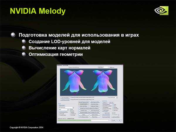 To optimize models (for example, if you have a model containing 1 million polygons, it's clear that no video card can process it, especially as this model is not the only one in the scene. But there is a way to delegate all detailing work to normal maps and to simplify the model to 1000 polygons) you can use a specialized tool – NVIDIA Melody: ![]() Modelling and geometry