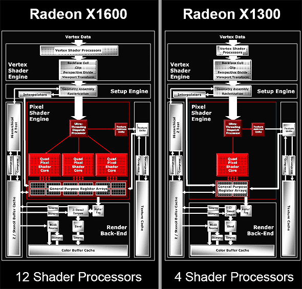 Don't forget that except for these five operations, a texture address operation can be executed in parallel (that is requesting data from TMU). Thus, in case of optimal shader code, we got the peak performance of 6 operations per cycle, which is (theoretically) comparable with the G70, taking into account the difference in architectural approaches to branching. But as we have already mentioned above, the scheme from ATI is better at branching. We shall test this assumption in practical tests. Interestingly, ATI is true to its approach — 3+1 (two different operations can be executed, one - over three components of a vector, the other - over a scalar, being the fourth component). In the majority of cases, the approach taken by NVIDIA (an option of 2+2 or 3+1) can be considered more efficient, but this difference will have a little effect on typical graphics tasks. Another major issue of the new architecture — caching compressed data — both Z / Frame buffer values and texture data are stored in caches in compressed form. They are decompressed on the fly, when they are accessed from the corresponding units. Thus the caching efficiency grows higher. You can say that the cache sizes are virtually increased several-fold. It would be logical to assume that such an architecture with separated texture and pixel units will be easily scalable: ![]() As we can see, RV530 and RV515 are built on the same scheme. There is only one quad left in the RV515 — it simplifies many aspects, including the magic box of the dispatcher. The situation with the RV530 is more complex — it has three pixel quad processors, but only one texture unit. As a result, we have 12 pixel processors and 4 TMUs, even if used in the optimal way, nearly without downtime. Of course, in case of simple shaders without complex calculations, pixel processors will be idle waiting for texture data. But modern shaders, for which this chip is intended, are often up to much calculations (5-8 commands) per one texture access, justifying this scheme. To all appearances, the number of transistors spent on the texture part of the chip is greater than in case of pixel ALUs. That's why this disbalance is justified from the point of view of ATI designers. In fact, giving up 6-8 texture units allows 12 (instead of 8 or 4) pixel processors, keeping the same complexity of the chip. How justified it is in practice depends on the efficiency of ATI texture units (that's what the designers pin their hopes on), on the efficiency of the dispatcher, and on the ratio of various commands in executed shaders. It's hard to guess, we shall check up on this aspect in our practical section with various tests. But now we shall just warm your interest to the question — whether the ATI's move is justified and how it will affect the competition with NVIDIA, especially in the light of the awaited soon 12-pipeline G70 (G72). On output interfacesThe new accelerators support HDCP format for both DVI interfaces. Senior R520-based models are capable of applying HDMI (High Definition Media Interface, the interface for outputting video and audio to digital theatres and other audio-video playback devices of the new generation) to DVI connectors. You can learn more details on popular interfaces in our R520 preview. Conclusions