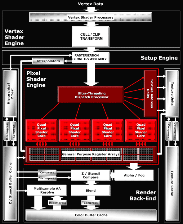 It goes without saying that there will later appear new reference configurations and new cards from ATI. As for now, we shall note a delay, nearly to December, in the availability of RV530-based products (this chip was developed later than the R520; it features some of the traits of the future R580, hence the delay with mass production) an of the top product in this series — X1800 XT. That's a bit disappointing, it means that the fastest accelerator will be most likely a press-card for nearly a whole month (reviewers got their samples by the announcement time), intended to compete with the G70 in reviews rather than on the store shelves. That may be the fault of the yield of effective chips or some other reasons, but we shall not see this card on the shelves until the 5th of November. Taking into account the high competition potential of the RV530 and the chances of the 1800XT to outperform the GeForce 7800 GTX, we can just lament these delays — it would have been much better, if all the products of the new series, long-expected by ATI fans, had appeared in stores right now. R520 ArchitectureWe are not going to publish our own diagram this time. Instead, we'll provide an ATI scheme — it offers a praiseworthy detailing level and shows all necessary issues. Let's have a closer look: ![]() Architecture of vertex processorsThere are 8 identical vertex processors (they are inside the Vertex Shader Processors unit on the diagram). They comply with SM3 requirements and are based on ATI's standard 3+1 scheme (ALU of each vertex processor can execute two different operations simultaneously over three vector components and the fourth component or a scalar). In fact, vertex processors have become similar to what we saw in the NV4X and the G70, for the only exception — they offer the 3+1 scheme instead of 4+1 (those processors could process a 4-component vector and a scalar). The G70 scheme can potentially offer higher performance, but the real difference may be practically unnoticeable, especially in our times, when vertex processors rarely act as a rendering bottleneck. Later on we shall investigate (and test) the question of the implementation and efficiency of texture access from ATI vector processors. Architecture of the pixel partThat's where the most interesting things are hidden. Have a look at the diagram above — unlike NVIDIA, the texture units are outside the common pipeline. The chip architecture may be called distributed — there is no common long pipeline to run quads through, as in case of NVIDIA. The texture part exists separately — texture address units and TMUs. Pixel processors (performing arithmetic and other operations) and register arrays stand separately. This scheme has its pros and cons. The main disadvantage — it suits well the phase mechanism, when active texture sampling precedes texture calculations (Shaders 1.X and old programs with stages), bit it is fraught with unjustified latencies in dependent texture samples, which can be often found in modern Shaders 2.X and 3.0. Think about it — one texture access command really calls a lengthy operation for many cycles and the shader processor should stand idle for all this time? Nothing of the sort — ATI settles the point rather smartly! Moreover, this solution is universal, not only does it effectively execute dependent samples, it also increases efficiency of the pixel part in shaders with conditions and branches (compared to NVIDIA's approach). ATI calls this technology hyper threading. OK, how does it work? The magic box (Ultra Threading Dispatch Processor) directs the execution — it processes 512 quads simultaneously, each of them can be at a different shader execution stage. Each quad is stored together with its current status, current shader command, values of previously checked conditions (information on the current branch of a conditional jump). NVIDIA chips run quads in circle, one after another. Maximum they can do is to skip quads, which don't fall under the current branch of a condition. The R520 operates differently — our magic box constantly monitors free resources (be it texture or pixel units) and directs queued quads into free devices. If a quad fails a condition and should not be processed by this or that shader part, it will not hang about in circles, taking up room and time, together with the other quads, which need to be processed. It will just skip unnecessary commands and will not load a texture or pixel unit. If a quad waits for data from a texture unit — it will let other quads forward, which will load pixel units for this time. Thus, this approach kills two birds with one stone — it hides texture access latency and allows efficient usage of computing and texture resources when shaders with conditions and branches are executed. Efficiency of both issues depends directly on the number of quads that our magic box can process. 512 look like an imposing set (we can get textures for 4 quads and process 4 quads in pixel processors per cycle; thus up to 8 quads are processed each cycle, while the rest of the quads wait for their turn or wait for data from texture units). This unit is undoubtedly complex and the dispatching logic for this quad set takes up a considerable part of the chip, probably comparable with texture and pixel processors. Especially as register arrays actually belong to this unit as well — there must be lots of them to store efficiently all preliminary calculations for the 512 quads in queue. Now what concerns pixel processors and ALU. As we have already seen, pixel processors are grouped in four — that is we actually have four quad processors processing four pixels per cycle rather than 16 separate processors. Each such quad processor consists of the following units: ![]() and can execute the following operations over four pixels per cycle: