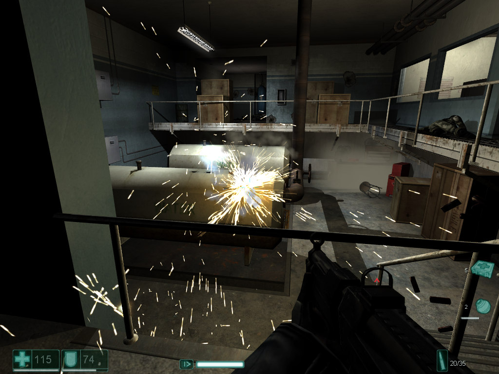 ![]() Unfortunately, unlike some other games (Far Cry, Half-Life 2), developers had to sacrifice simultaneous application of refraction and reflection effects - there is only reflection, and underwater objects are visualized without distortions. But the game does not suffer much from it, as unlike the two above-mentioned games, this one has no large lakes and rivers anyway. Besides, you will hardly manage to make out any refractions in the dark. The game pays special attention to the beauty of lighting effects. Developers' efforts were not wasted. These very effects attracted gamers in the first screenshots and amazed them in demo versions. Good-looking explosions and lots of sparks attract your attention immediately.
