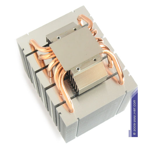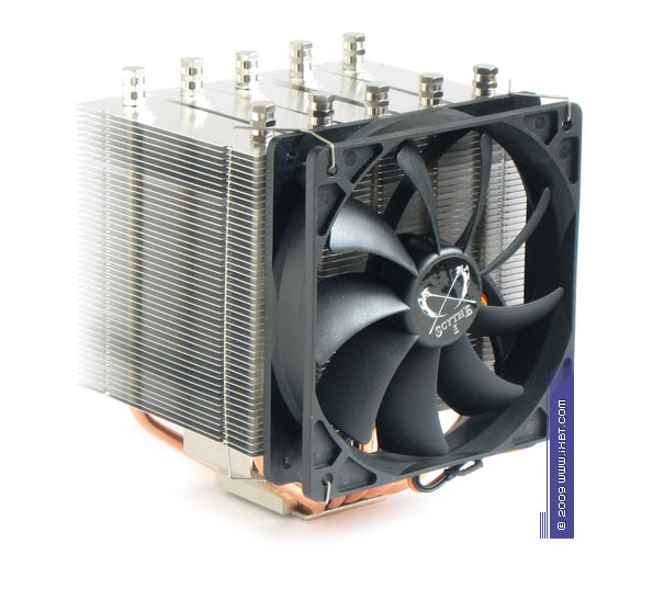 Scythe Mugen 2This product comes in a compact cardboard box with a comprehensible and detailed description of what's inside the box -- a detailed list of technical parameters and many photos. ![]() ![]() The bundle includes a heatsink, a fan (Slip Stream Series), a multiplatform retention kit (for a wide range of platforms -- Intel Socket 478, LGA775, LGA1366, AMD Socket 754/939/AM2), mounting clips for the fan, a satchel with thermal grease, and a user guide. ![]() The cooler has a 'tower-type' heatsink to be fitted with a bundled fan (120x120x25mm). Dimensions -- 130x100x158mm (without the fan). Weight -- 870g (without a retention module). ![]() The working medium of the cooler is formed by a copper base (38x50x2mm), an additional aluminum heatsink (80x38x33mm), five copper heat pipes (6mm in diameter), and a multi-section aluminum fin-stack (five sections, 46 fins each, total heat exchange surface area of about 10500cm2). ![]() ![]() ![]() ![]() ![]() Major advantages of the Mugen 2 design: