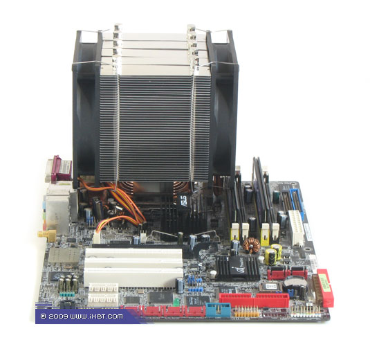 ![]() A weak spot of the Slip Stream fan is insufficient pressure (which is especially noticeable in low-speed modes). But the bundled fan can form a harmonic and efficient duet with the optimized heatsink of Mugen 2, where impedance is low (it's the nominal flow characteristic that matters here, not the pressure). So we can safely close our eyes to this issue in this cooler. Fan technical rating: excellent. The installation procedure of this cooler is not user-friendly in the true sense of this word. But it's better compared to competing coolers -- the cooler is mounted on the LGA775 platform with a support plate and bundled mounting brackets (to be screwed to the base plate). There are no other elements to install. ![]() But the LGA1366 platform may pose some problems that have to do with complex deinstallation of the reference socket plate. Usability advantages of Mugen 2: