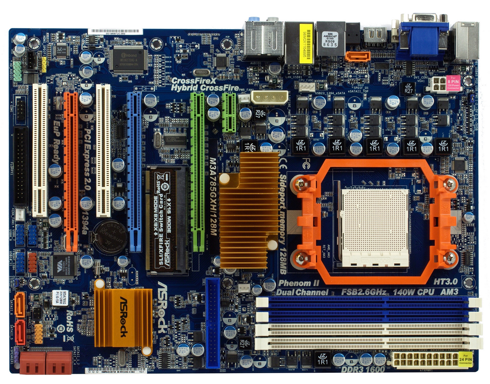 The list of compatible CPUs contains all products for Socket AM3. The board supports up to 16GB of DDR3-800/1066/1333/1600 RAM. Drives can be connected to 6 internal SATA/300 ports which can form RAID 0, 1, 0+1. One of the ports (orange) can be used as eSATA when connected to a corresponding orange port near the rear panel. The board also has the following additional controllers: