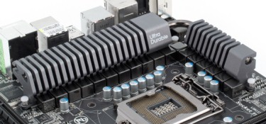 As we have already mentioned in previous reviews, Gigabyte utilizes the excellent DrMOS technology, although they don't call it that to avoid issues with MSI that has long been using that name (as well as the technology), not forgetting to mention it everywhere. The long and the short of it is that DrMOS chips are much more efficient than traditional MOSFETs and drivers. And, with Gigabyte being Gigabyte, space around the CPU socket is literally peppered with those (Vishay SiC769 in this case). The impressive 16 phases are however managed by a single 4-phase PWM controller from Intersil that has its outputs doubled and doubled again. This solution has obviously been designed with marketing, not engineering in mind — just for the sake of that nice, high number.