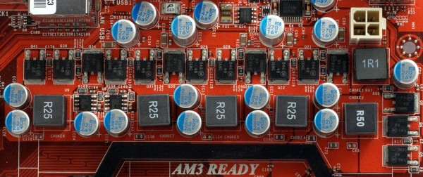 The VRM has 5 channels, 3 FETs per each. There are 10 x 820µF and 4 x 270µF solid capacitors. The motherboards supports processors with up to 125W TDP.