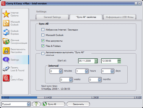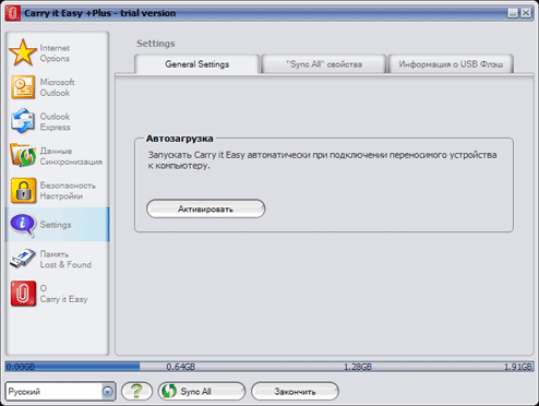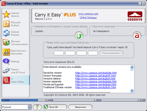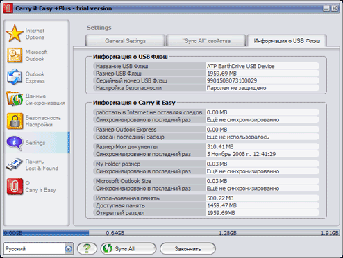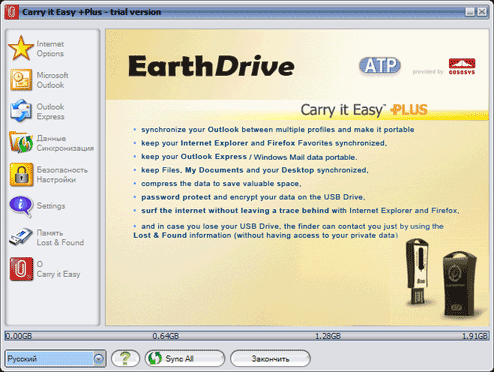 What concerns additional functionality, the manufacturer copied Carry it Easy Plus from CoSoSys SRL to the flash drive. First of all I was pleased with the fact the product comes with a commercial utility (24.95 EUR), but it turned out that the key to this program is not included into the bundle. So it will work for 30 days of trial and then you'll have to buy it or delete it. However, registration of the ATP version costs 14.95 EUR. so the utility comes with a big discount. And the program itself is really very convenient and useful, so let's take a closer look at it. ![]() When the program is run for the first time, it prompts a user to enable its autostart option when the flash drive is plugged to a computer. It's a very useful option, which is not available in the Light version of the program. ![]() We are already familiar with the main window, but the Light version lacked the Sync All button (as it could sync only files, it did not need this feature), and icons in the left part of the window are all active now. ![]() You can carry with you not only usual files with data. For example, you mention an interesting website at your friend's, and he wants to know the address.. and then you make a helpless gesture and say that you bookmarked it, but don't remember the address. Sounds familiar? You bet! Or you may want the address yourself, and you cannot remember it. So you'd better carry your bookmarks with you in a flash drive. As you can see, the program supports both most popular browsers -- Internet Explorer and FireFox. It cannot convert favorites of the former to bookmarks of the latter and back, but that's not what it's written for. Especially as web surfers, who use both browsers, usually employ one of them as the main tool, while the second browser may even come with an empty list of bookmarks. ![]() Another useful option is anonymous operations in Internet, which is especially handy when you have to use someone else's computer to surf the Web. You can clean temp files manually, of course, but why bother? Computers were invented to perform routine operations, weren't they? ![]() If you use Outlook, you are sure to appreciate syncing with it or creating backups of its data. What concerns me, I don't use Outlook, so I cannot evaluate this feature. ![]() Similar features are available for Outlook Express, but I don't have it installed either. However, lots of people use this program, and it does not have a portable version (unlike many other competing solutions), so synchronization with a flash drive will certainly be very popular. ![]() The next two tabbed paged allow to configure synchronization of any files between computers and flash drives (plain copying, ZIP archiving, AES encryption with a 128-bit key, or both). ![]() Let's have a look at settings. The first page configures autostart of the utility, when the drive is plugged to a computer. ![]() The second page configures Sync All. Full sync (you can configure what files to sync manually) can be performed by pressing the corresponding button, or you can schedule it. ![]() The last tab in this group displays various information. The program 'knows' a lot of flash drives, so it can show you the name of your product and even its serial number. And the same window displays a detailed report about the program itself: which functions are enabled, how much space is occupied by each option, when the last sync was run, etc. ![]() Like all small objects, flash drives are often lost by their owners. This utility allows to encrypt your data so that nobody could read your files. But that's not all. Sometimes a person who finds your flash drive is eager to return it to its owner, but to whom? And where? All flash drives look alike. You can sometimes fish owner info out of them, but you will have to look through the files to find this private information, which is not easy to locate. Sticking a label to the drive may solve the problem. But Carry it Easy offers a better solution -- to store contact information in the program itself. This feature may help the drive return to you. ![]() And the last tab is responsible for program updates and registration. So, this is a powerful and easy-to-use utility. But we should thank CoSoSys for it, not ATP. ATP also made its contribution by providing a discount. Just compare: if you download the program from CoSoSys website, you will have to pay 24.95 EUR for it; if we buy a flash drive from Verbatim, the upgrade from Light version will cost 16.99 EUR, and in this case you pay only 14.95. On the other hand, I like Verbatim's approach better -- you get some of the functions with these drives for free. Write a comment below. No registration needed!